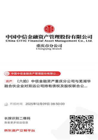 中國中信金融資產(chǎn)管理股份有限公司重慶市分公司(簡稱:中信金融資產(chǎn)重慶分公司)與蕪湖華融資本創(chuàng)榮投資中心(有限合伙)(簡稱:蕪湖華融合伙企業(yè))對重慶雙遠(yuǎn)實業(yè)(集團(tuán))有限公司(簡稱:雙遠(yuǎn)公司)持有債權(quán)及股權(quán),將于2025年12月9日08時30分至2025年12月9日17時30分在京東拍賣網(wǎng)通過公開競價方式進(jìn)行處置,拍賣鏈接如下圖所示,現(xiàn)予以公告。