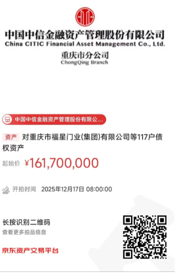 中國中信金融資產(chǎn)管理股份有限公司重慶市分公司(以下簡稱我分公司)擁有對重慶市福星門業(yè)(集團(tuán))有限公司等117戶不良債權(quán)資產(chǎn)。我分公司將于2025年12月17日8:00至2025年12月17日18:00止在京東拍賣網(wǎng)通過公開競價方式進(jìn)行處置,拍賣鏈接如下圖所示,現(xiàn)再次予以公告。