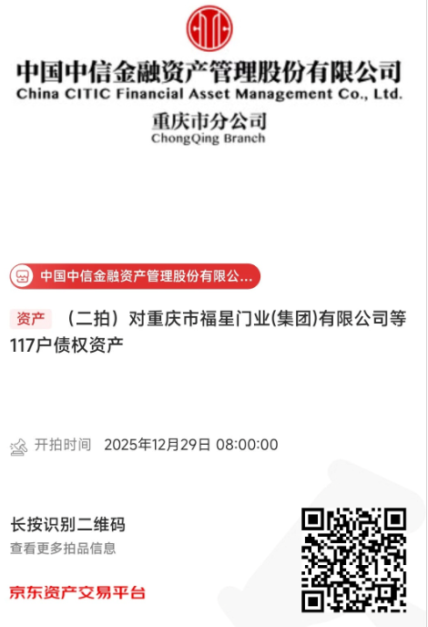 中國(guó)中信金融資產(chǎn)管理股份有限公司重慶市分公司(以下簡(jiǎn)稱我分公司)擁有對(duì)重慶市福星門業(yè)(集團(tuán))有限公司等117戶不良債權(quán)資產(chǎn)。我分公司將于2025年12月29日8:00至2025年12月30日17:30止在京東拍賣網(wǎng)通過(guò)公開競(jìng)價(jià)方式進(jìn)行處置,拍賣鏈接如下圖所示,現(xiàn)予以公告。